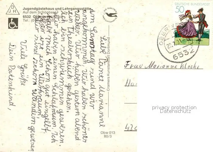 Oberwesel_Rhein Panorama Eingangshalle Lehrgangsstaette Kongresssaal Schlafraum Lehrgangsstaette Cafeteria Oberwesel Rhein postalisch gelaufen 1991 Erhaltung siehe scans [WerneD78] WernPID7