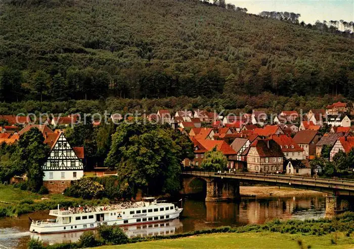 Oberweser_Hessen Bruecke zwischen Rheinhardswald und Solling mit Fahrgastschiff Oberweser Hessen postalisch gelaufen nach 1965 Erhaltung siehe scans [WerneD78] WernPID7