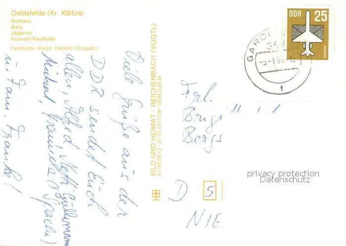 Oebisfelde Rathaus Burg Jaegerhof Konsum Kaufhalle Oebisfelde postalisch gelaufen 1990 Erhaltung siehe scans [FriedD77] Frierer