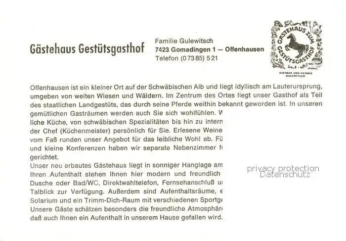 Offenhausen_Gomadingen Gaestehaus Gestuetsgasthof Offenhausen Gomadingen postalisch nicht gelaufen nach 1965 Werbekarte (keine Postkarte) Erhaltung siehe scans [WerneD78] Werbekarte (keine Postkarte) WernPID7