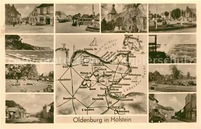 AK / Ansichtskarte Oldenburg_Holstein Panoramakarte Strand Kueste Kirche Oldenburg_Holstein