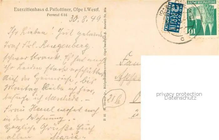Olpe__Stadt Exerzitienhaus der Pallottiner postalisch gelaufen 1949 Erhaltung siehe scans [FriedD77] Frierer