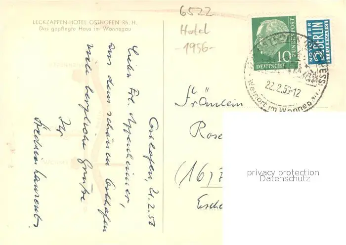 Osthofen_Rheinhessen Leckzapfen-Hotel Aussenansicht Osthofen_Rheinhessen postalisch gelaufen 1956 Erhaltung siehe scans [LiesaD40] LiesID40