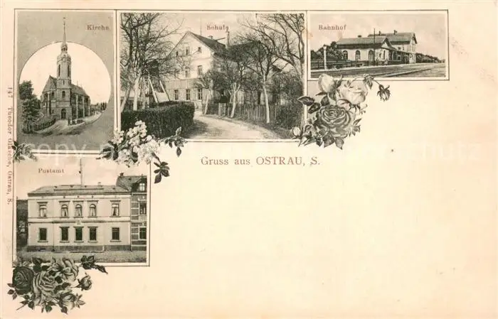Ostrau_Sachsen Kirche Postamt Schule Bahnhof Ostrau_Sachsen postalisch gelaufen bis 1920 Erhaltung siehe scans [WerneD78] WernPID7