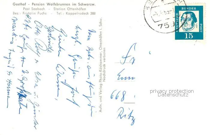 Ottenhoefen_Schwarzwald Gasthof Wolfsbrunnen Ottenhoefen Schwarzwald postalisch gelaufen 1958 Erhaltung siehe scans [WerneD78] WernPID7