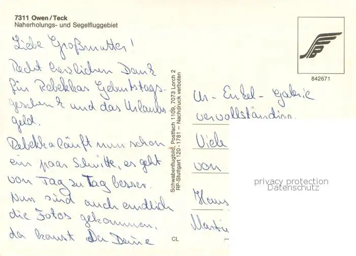 Owen_Esslingen Naherholungs- und Segelfluggebiet Owen Esslingen postalisch nicht gelaufen nach 1965 Fliegeraufnahme Erhaltung siehe scans [FriedD77] Fliegeraufnahme Frierer