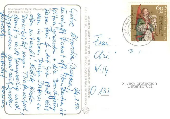 Oy Fliegeraufnahme mit Allgaeuer Alpen Oy postalisch gelaufen 1992 Erhaltung siehe scans [WerneD78] WernPID7