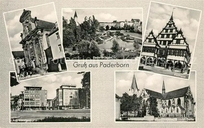AK / Ansichtskarte Paderborn Franziskanerkirche Paderanlagen Rathaus Am Westerntor Dom Suedost Seite Paderborn