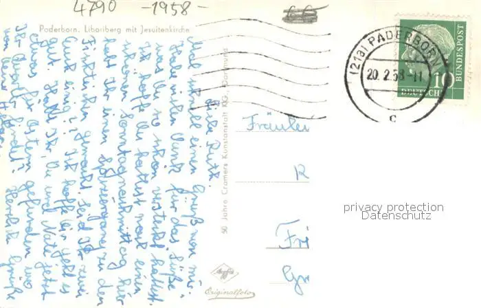 Paderborn Liboriberg mit Jesuitenkirche Paderborn postalisch gelaufen 1958 Erhaltung siehe scans [WerneD78] WernPID7