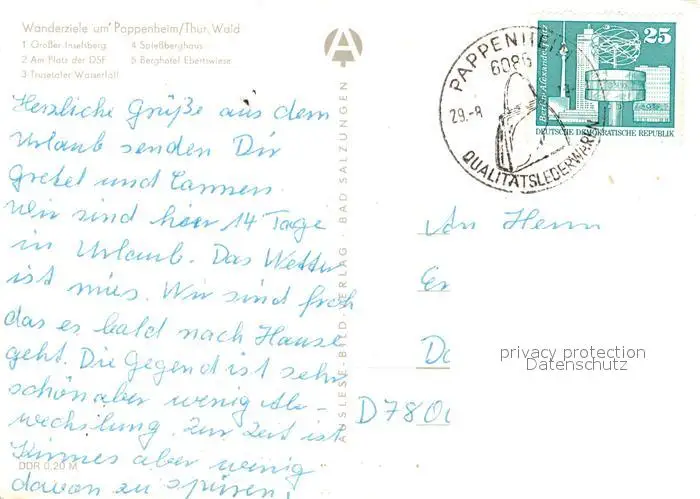 Pappenheim_Thueringen Grosser Inselsberg Platz DSF Trusetaler Wasserfall Berghotel Pappenheim Thueringen postalisch gelaufen nach 1965 Erhaltung siehe scans [KathaD81] Kathoren