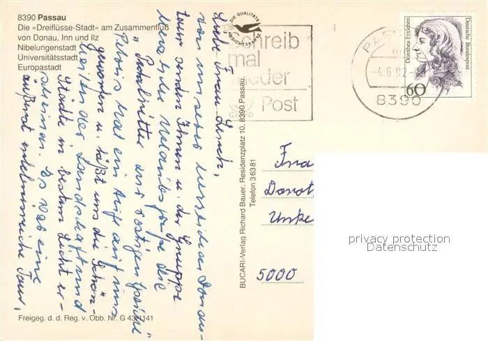 Passau Fliegeraufnahme am Zusammenfluss von Donau Inn und Ilz Passau postalisch gelaufen 1992 Erhaltung siehe scans [WerneD78] WernPID7