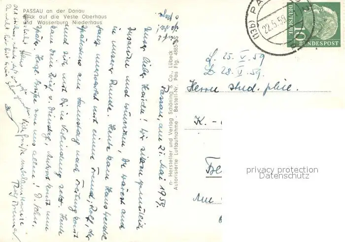 Passau Veste Oberhaus und Wasserburg Niederhaus Fliegeraufnahme Passau postalisch gelaufen 1959 Erhaltung siehe scans [WerneD78] WernPID7
