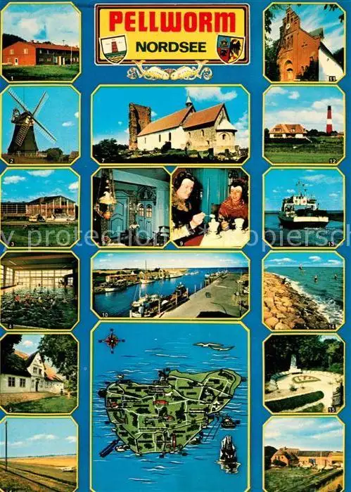 AK / Ansichtskarte Pellworm Windmuehle Alte Kirche Leuchtturm Wellenbad Faehre Trachten Cafe Hafen Kueste Landschaft Landkarte Pellworm