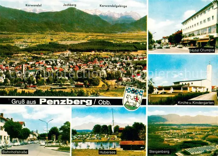 AK / Ansichtskarte Penzberg Panorama mit Karwendelgebirge Hotel Olympia Kirche Kindergarten Bahnhofstrasse Steigenberg Hubersee Penzberg