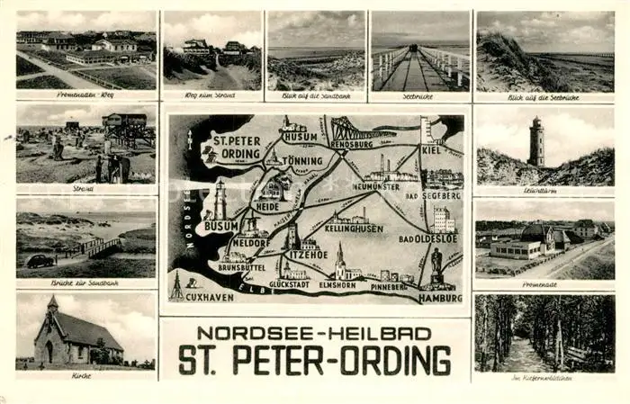 Peter-Ording_St Leuchtturm Kirche Strand Panoramakarte Peter-Ording_St postalisch gelaufen 1955 Erhaltung siehe scans [KathaD81] Kathoren