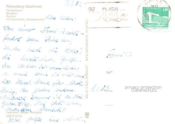 Petersberg_Halle Fernsehturm Bergbad Pavillon HOG Waldschenke Petersberg_Halle postalisch gelaufen 1982 Erhaltung siehe scans [FriedD77] Frierer