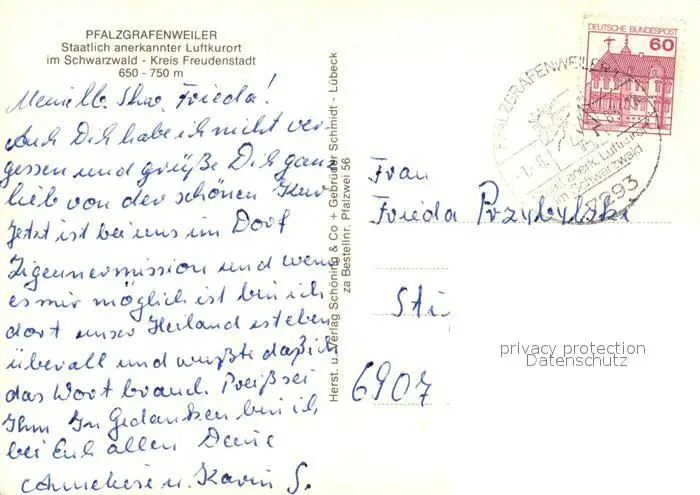 Pfalzgrafenweiler Panorama Marktplatz Brunnen DRK Landessanitaetsschule Waldpartie Kirche Gaestehaus Freibad Schild Pfalzgrafenweiler postalisch gelaufen 1983 Erhaltung siehe scans [FriedD77] Frierer