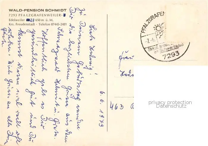 Pfalzgrafenweiler Wald Pension Schmidt Zimmer Stube Pfalzgrafenweiler postalisch gelaufen 1979 Erhaltung siehe scans [WerneD78] WernPID7