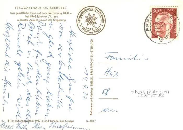 Pfronten Berggasthaus Osterhuette mit Aggenstein und Tannheimer Gruppe Pfronten postalisch gelaufen 1972 Erhaltung siehe scans [WerneD78] WernPID7