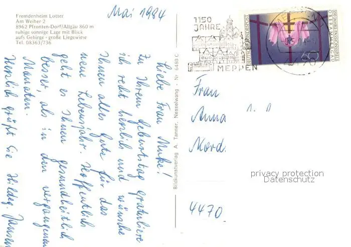 Pfronten Fremdenheim Lotter Pfronten postalisch gelaufen 1984 Erhaltung siehe scans [WerneD78] WernPID7