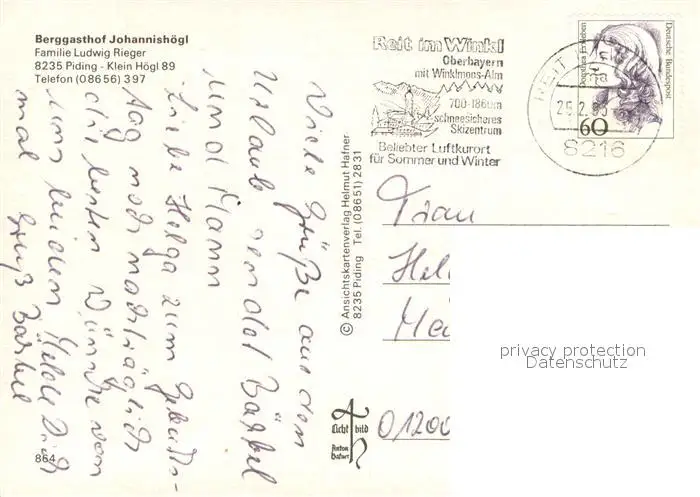 Piding Berggasthof Johannish?gl Piding postalisch gelaufen 1993 Erhaltung siehe scans [LiesaD40] LiesID40