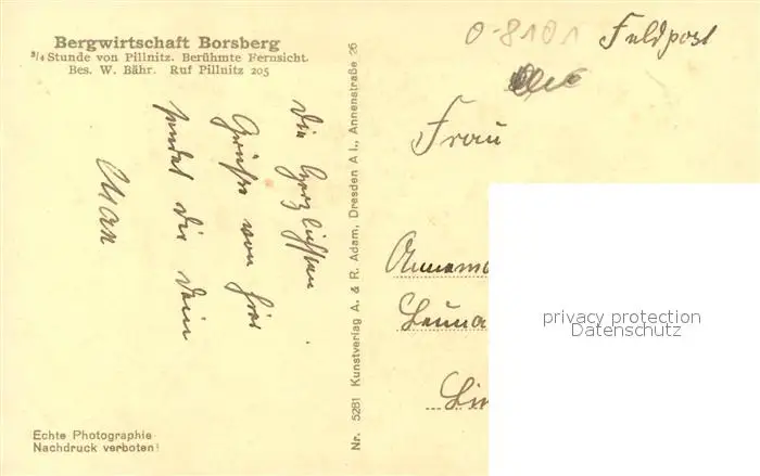 Pillnitz Bergwirtschaft Borsberg mit Aussichtsturm Feldpost Pillnitz postalisch nicht gelaufen 1921-1965 Erhaltung siehe scans [WerneD78] WernPID7