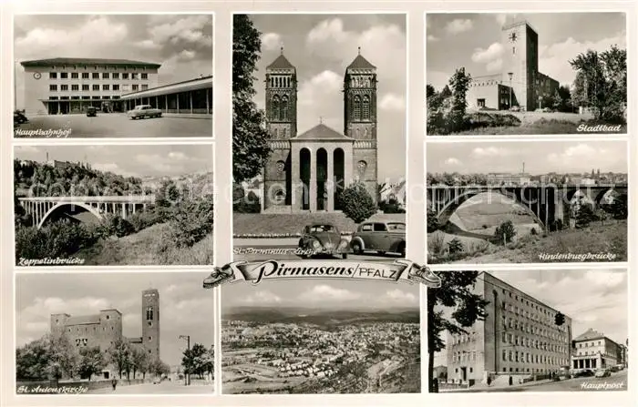 AK / Ansichtskarte Pirmasens Hauptbahnhof Zeppelinbruecke St Pirminius Kirche Stadtbad Hindenburgbruecke St Antonskirche Hauptpost Pirmasens