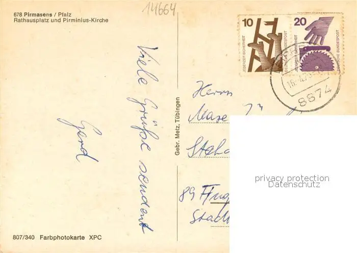 Pirmasens Rathausplatz und Pirminius Kirche Pirmasens postalisch gelaufen 1973 Erhaltung siehe scans [WerneD78] WernPID7