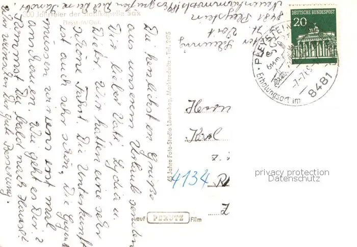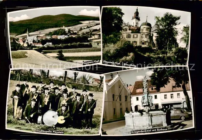 Pleystein Panorama Kreuzberg Stadtkapelle Kriegerdenkmal mit Rathaus Pleystein postalisch gelaufen 1966 Erhaltung siehe scans [FriedD77] Frierer