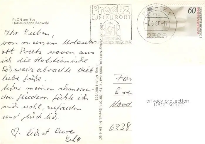 Ploen_See Schloss Naturpark Holsteinische Schweiz Fliegeraufnahme Ploen_See postalisch gelaufen 1986 Erhaltung siehe scans [FriedD77] Frierer
