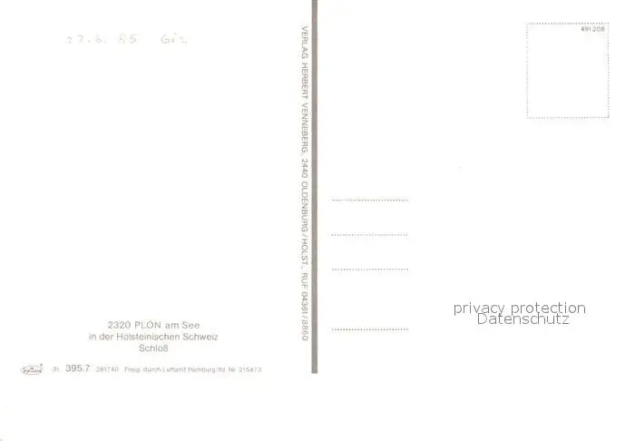 Ploen_See Schloss Naturpark Holsteinische Schweiz Fliegeraufnahme Ploen_See postalisch nicht gelaufen 1985 Erhaltung siehe scans [FriedD77] Frierer