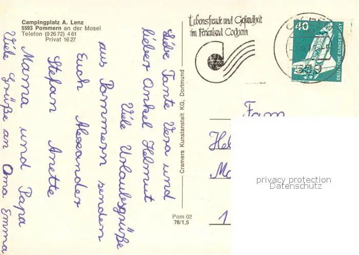 Pommern_Mosel Campingplatz Lenz Gaststaette Freibad Blick ueber die Mosel Pommern Mosel postalisch gelaufen 1977 Erhaltung siehe scans [FriedD77] Frierer