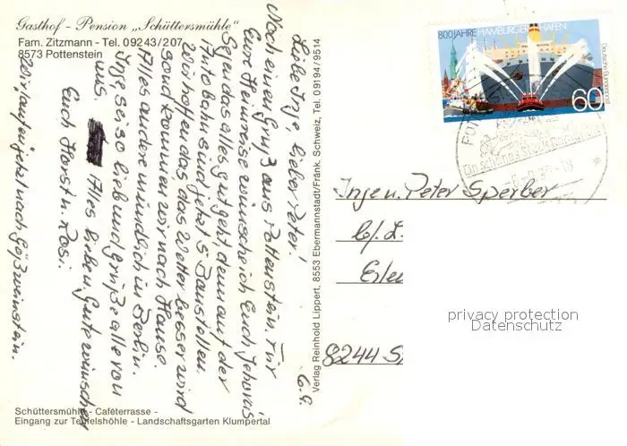 Pottenstein_Oberfranken Gasthof Pension Schuettersmuehle Brunnen Teiche Pottenstein_Oberfranken postalisch gelaufen 1988 Erhaltung siehe scans [WerneD78] WernPID7
