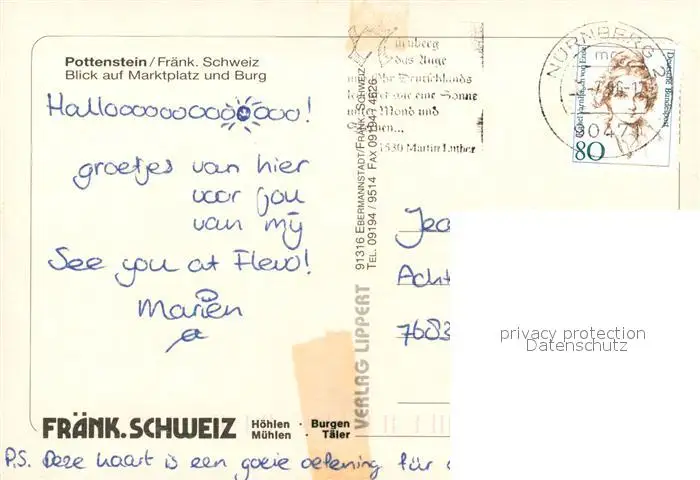 Pottenstein_Oberfranken Marktplatz Burg Altstadt Fachwerkhaus Brunnen Pottenstein_Oberfranken postalisch gelaufen 1996 Erhaltung siehe scans [FriedD77] Frierer