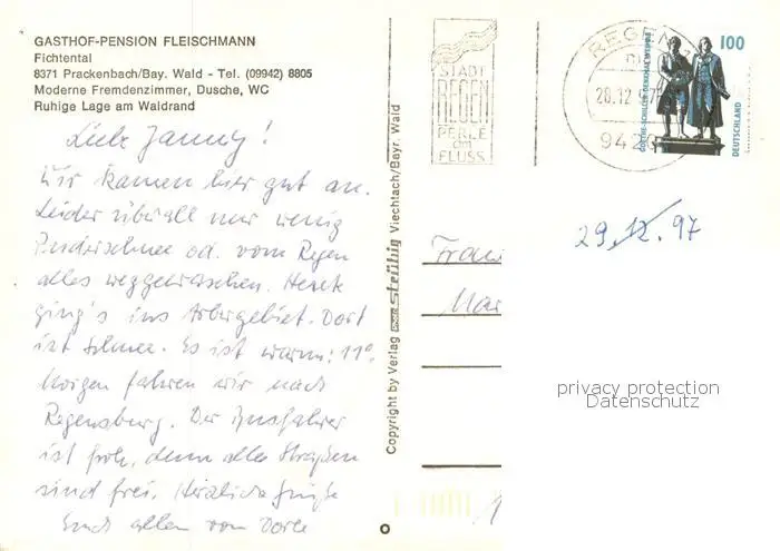 Prackenbach Gasthof Pension Fleischmann Wegweiser Winterlandschaft Prackenbach postalisch gelaufen 1997 Erhaltung siehe scans [FriedD77] Frierer