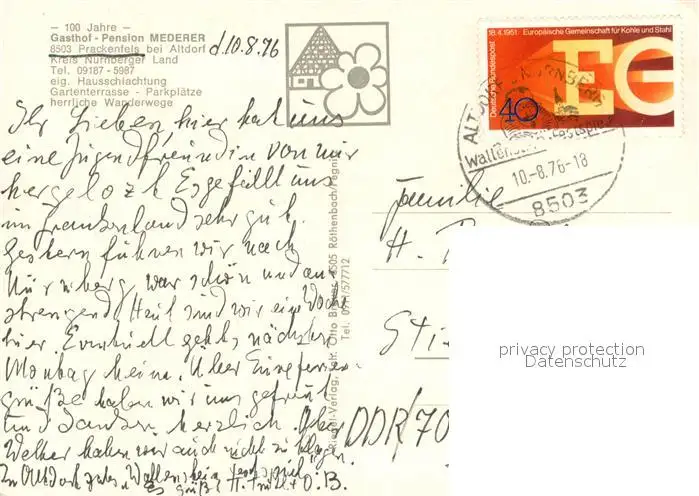 Prackenfels_Nuernberg Gasthof Pension Mederer Schwarzachtal Teufelshoehle Terrasse Gaststube Prackenfels Nuernberg postalisch gelaufen 1976 Erhaltung siehe scans [WerneD78] WernPID7