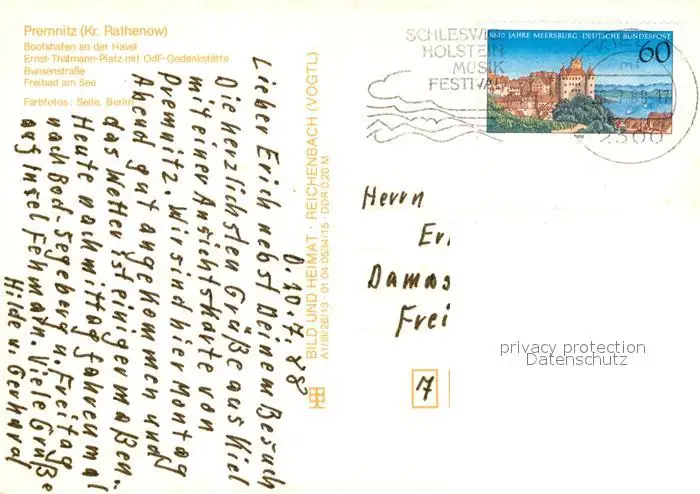 Premnitz Bootshafen Ernst Thaelmann Platz OdF Gedenkstaette Freibad Premnitz postalisch gelaufen 1988 Erhaltung siehe scans [KathaD81] Kathoren