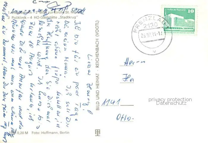 Prenzlau Wasserturm Kirche St Marien Poliklinik HO Gaststaette Stadtkrug Prenzlau postalisch gelaufen 1984 Erhaltung siehe scans [FriedD77] Frierer