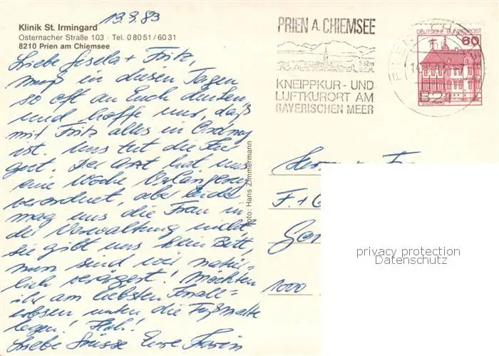 Prien_Chiemsee Klinik St Irmingard Prien Chiemsee postalisch gelaufen 1983 Erhaltung siehe scans [FriedD77] Frierer