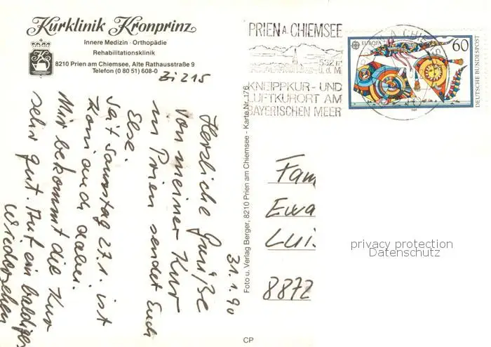 Prien_Chiemsee Kurklinik Kronprinz Hallenbad Panorama Schiffsanleger Gastraeume Prien Chiemsee postalisch gelaufen 1990 Erhaltung siehe scans [WerneD78] WernPID7