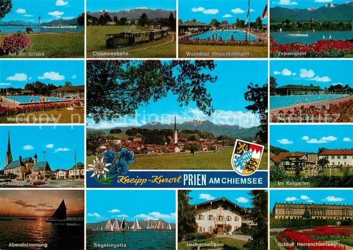 AK / Ansichtskarte Prien_Chiemsee Schaere Freibad Heimatmuseum Chiemseebahn Kurgarten Schloss Herrenchiemsee Prien Chiemsee