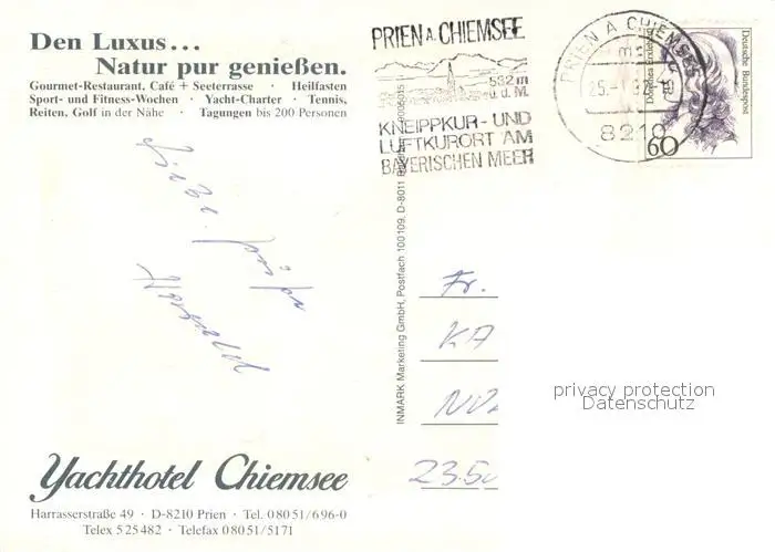 Prien_Chiemsee Yachthotel Chiemsee Yachthafen Prien Chiemsee postalisch gelaufen 1982 Fliegeraufnahme Erhaltung siehe scans [FriedD77] Fliegeraufnahme Frierer