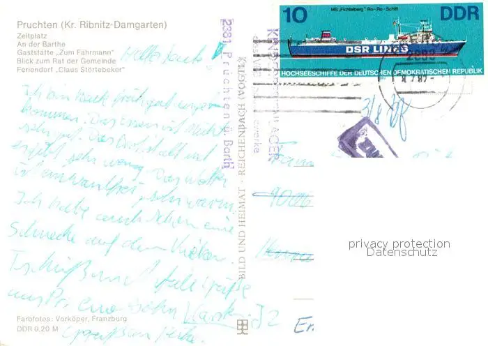 Pruchten_Mecklenburg_Vorpommern Zeltplatz An der Barthe Gaststaette Zum Faehrmann Rat der Gemeinde Feriendorf Claus Stoertebeker Pruchten_Mecklenburg postalisch gelaufen 1987 Erhaltung siehe scans [WerneD78] WernPID7