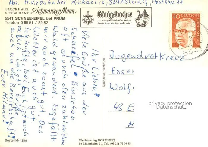 Pruem_Eifel Blockhaus Restaurant Schwarzer Mann Pruem_Eifel postalisch gelaufen 1975 Erhaltung siehe scans [FriedD77] Frierer