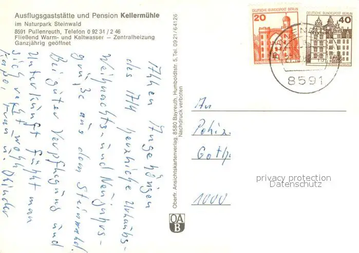 Pullenreuth Pension Kellerm?hle Restaurant Pullenreuth postalisch gelaufen 1982 Erhaltung siehe scans [LiesaD40] LiesID40