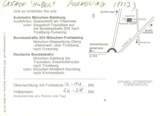 Purkering_Trostberg Gasthof Huber Gaststube Freiterrasse Schwimmbad Purkering_Trostberg postalisch gelaufen nach 1965 Werbekarte (keine Postkarte) Erhaltung siehe scans [WerneD78] Werbekarte (keine Postkarte) WernPID7