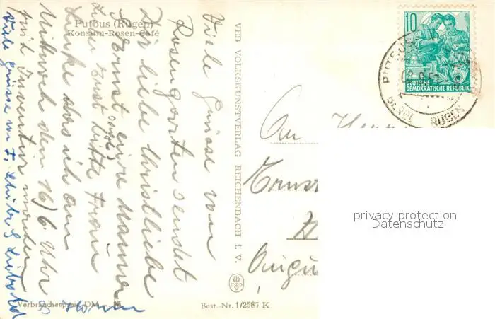 Putbus_Ruegen Konsum Rosen Cafe Putbus Ruegen postalisch gelaufen 1953 Erhaltung siehe scans [WerneD78] WernPID7