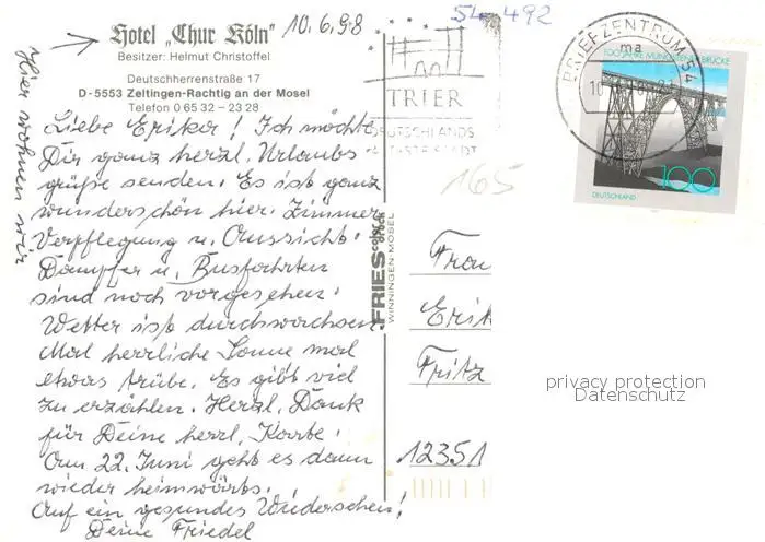 Rachtig Hotel Chur Koeln Rachtig postalisch gelaufen 1998 Erhaltung siehe scans [KathaD81] Kathoren