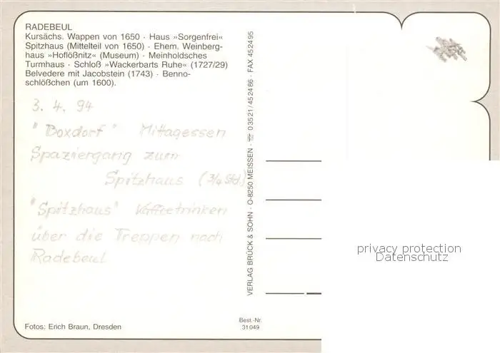 Radebeul Kursaechsiches Wappen Spitzhaus Museum Turmhaus Schloss Belvedere Jacobstein Schloesschen Radebeul postalisch nicht gelaufen nach 1965 Erhaltung siehe scans [FriedD77] Frierer