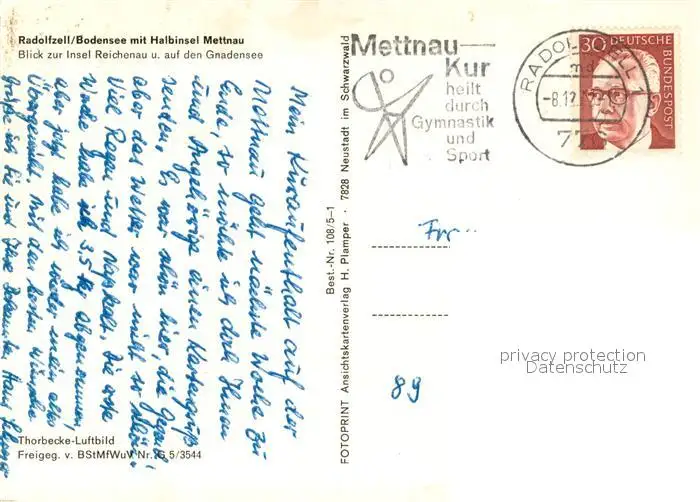 Radolfzell_Bodensee Fliegeraufnahme mit Halbinsel Mettnau Insel Reichenau und Gnadensee Radolfzell Bodensee postalisch gelaufen 1973 Erhaltung siehe scans [FriedD77] Frierer